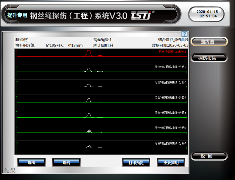 在系統軟件中可查看實時探傷曲線,探傷數據報表實時了解鋼絲繩損傷狀況,記錄鋼絲繩隨時間變化的損傷狀態(趨勢)。系統增加智能化AI統計算法,有效的剔除異常雜點,使探傷數據準確可靠,重復性好。同時增加無標定算法,可有效解決設備溫度引起的漂移和檢測方向干擾問題。