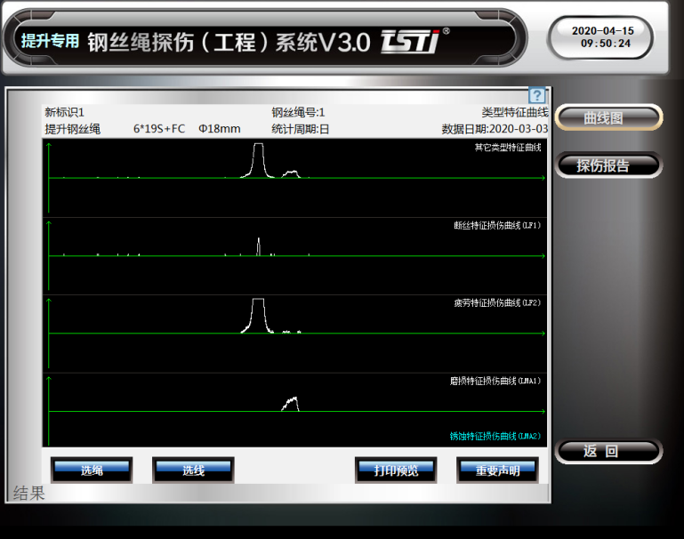TST鋼絲繩探傷(工程)系統(tǒng)是一種針對各種工況提升鋼絲繩的損傷現(xiàn)象實時在線無損探傷的工程設(shè)備系統(tǒng)。該系統(tǒng)以“KJ578煤礦用鋼絲繩探傷系統(tǒng)”為硬件平臺,搭載“TST鋼絲繩探傷(工程)系統(tǒng)V4.0”專業(yè)分析軟件,采用“變量補償傳感器”、“三維磁感應(yīng)橋”和“自平衡同步勵磁”等無損探傷專利技術(shù)綜合集成可全天候無人值守在線實時探測鋼絲繩內(nèi)外部斷絲、銹蝕、疲勞、磨損及變形等各種損傷隱患,通過LMA曲線分析,評估鋼絲繩的使用壽命。